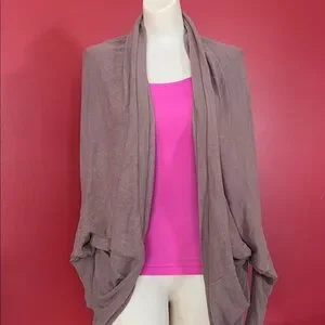Stay cozy and stylish with this taupe open front sweater. Perfect for layering over your favorite outfits. The last few pictures show it on. It has a unique cut that looks stunning on. As always smoke and pet free home. Same day shipping! Willing to negotiate prices. Very hard to measure as the cut is strange but approximately 22 inches pit to pit and 26 inches from shoulder to bottom of cardigan. Amazing color that goes with anything.
