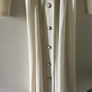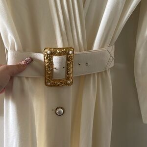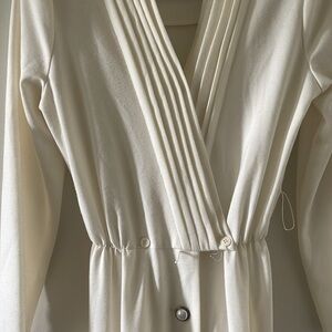 Chic cream long-sleeve dress featuring a stylish belt and button details. Perfect for any occasion.