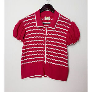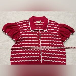 Chic red cardigan with white wave pattern. Features puff sleeves and button-up front. Perfect for layering.