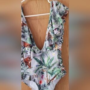 Stylish one-piece swimsuit with a tropical print. Features vibrant green leaves and orange tigers. Perfect for a beach day.