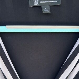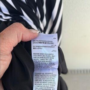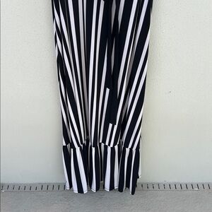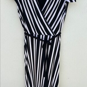 This stylish maxi dress by INC International Concepts features a striking black and white color striped scheme with a flattering v-neckline and flutter sleeves. The sheath silhouette is perfect for casual and cocktail occasions, offering a sophisticated and versatile look. A waist tie detail adds a touch of definition to the flowing design. Lined. Size L. No flaws.