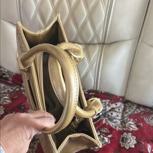Luxurious gold tote with quilted pattern. Stylish and versatile.