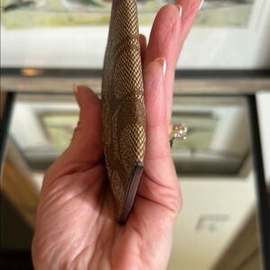 Elegant Coach card holder in tan and brown. Features a colorful logo design. Ideal for keeping essentials organized.