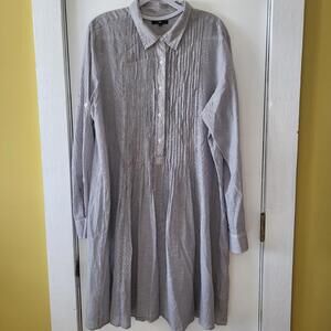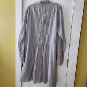 striped shirt dress features a classic collared neckline, long sleeves with adjustable button tabs, and vertical pleating on the front chest and back half for a structured yet relaxed look. Buttons half way down closure front