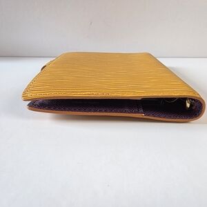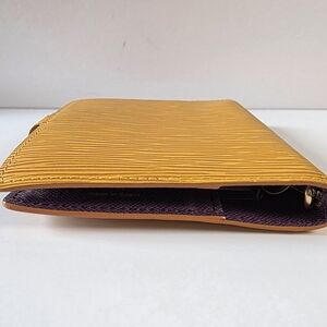 Authentic Louis Vuitton Agenda PM in vibrant yellow Epi leather with rich purple interior.