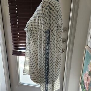 Chic button-down shirt with blue floral collar. White base with blue circular pattern. Ideal for versatile styling. Runs small for Free People sizing. Super soft polyester fabric.