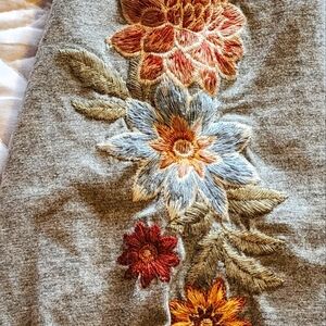 This Driftwood embroidered long-sleeve top blends casual comfort with bohemian charm. Made from 100% cotton, this soft gray top features beautiful floral embroidery across the chest and down the sleeves in warm, earthy tones. The relaxed fit and puffed sleeves with cuffed wrists give it a stylish, feminine silhouette, while the classic crew neckline keeps it effortlessly versatile. Perfect for layering or wearing on its own, this piece adds a touch of boho elegance to any casual wardrobe.