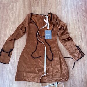 Elegant brown mini dress. Long sleeves with black trim. Perfect for a night out.