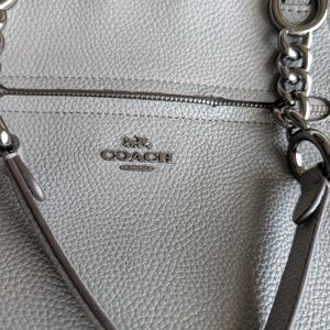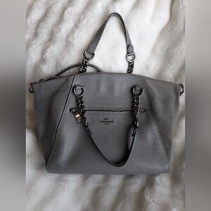 Authentic Coach shoulder bag in soft gray featuring pebbled leather, suede side panels, and gunmetal chain detail handles.