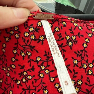 Adorable deep V low cut red dress with daisy print and balloon sleeves by Free People. Faux wrap front.