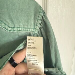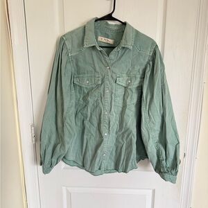 Vintage-inspired denim top featured in a button-front silhouette with exaggerated sleeves and contrast stitching for added dimension.