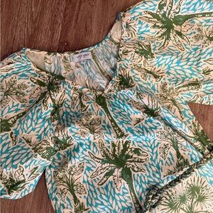 • Print: Tropical palm/leaf motif with mixed geometric border