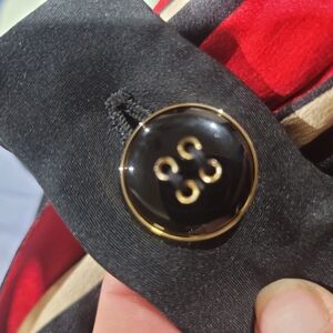 The Look: Bold, graphic vertical stripes in red, black, and ivory.