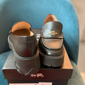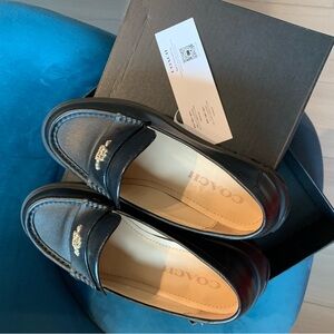 Elegant black leather loafers by Coach. Features a sleek design with a comfortable fit. Perfect like new condition.Original box included.