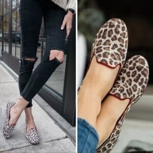 Our loafer is a modern take on a timeless shoe. This leopard with dark red piping and signature blue piping will be your new favorite shoe. Pair with black skinny jeans for an effortlessly cool look. The color is oversized leopard print in neutral tones of beige.