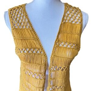 Keywords: Boho, Bohemian, Western, Festival, Coachella, Hippie, Gypsy, Mustard Yellow, Longline Vest, Macrame, Crochet, Fringe, Cowgirl, Layering Piece, Summer Style