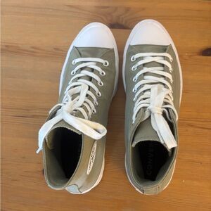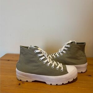Stylish high-top sneakers. Olive green durable canvas with white laces. Durable lugged platform rubber sole.