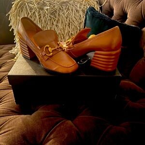 Stylish Cognac leather loafers featuring a gold buckle detail. Perfect for a classic look. The shoes are sz 6, the box says 7.5, but they are a sz 6.