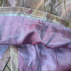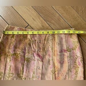 Beautiful vintage Beth Bowley paisley velvet skirt featuring soft pastel tones of pink, mauve, olive, and cream. Luxe textured velvet with a subtle sheen and a flattering button-front design. Fully lined for comfort and structure.