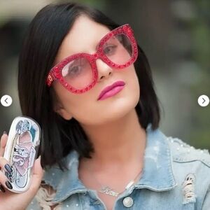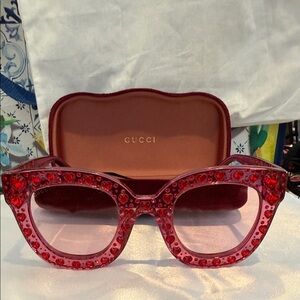 Chic Gucci sunglasses with red crystal accents. Bold and luxurious design. Perfect for a standout look.