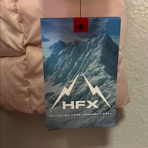 This light pink HFX puffer jacket is designed for winter warmth and functionality. It typically features a faux fur-trimmed hood (often detachable) and a water-resistant quilted shell.