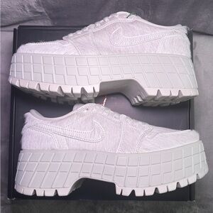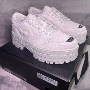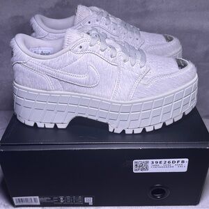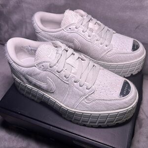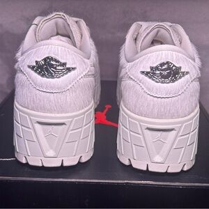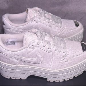 Jordan adding Platforms to the Jordan 1s, Makes the perfect shoe! These shoes have a furry detail with silver hardware on the tip and back of shoe. The silver gives the shoe a beautiful statement. Super clean, chunky Jordans.