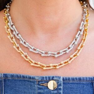 Bold yet elegant, the Ginny CZ Chain Link Necklace adds a refined edge to any look. Crafted w/18k gold plating, this 18” adjustable necklace features a sleek chain link design accented w/shimmering CZ details for a luxe finish. Tarnish-resistant & perfect for layering or wearing solo, it’s ideal for special occasions, nights out, or adding a statement touch to any outfit.