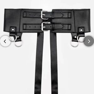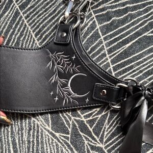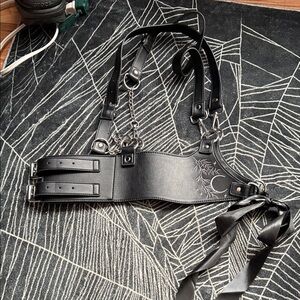 Elevate your style with this chic black leather harness, featuring a stylish bow accent. Perfect for adding a bold statement to any ensemble.