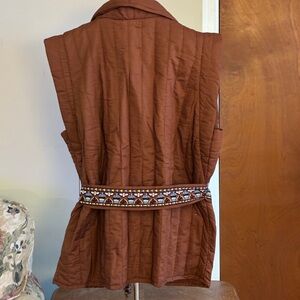 Stay cozy and stylish with this brown quilted vest. Perfect for layering, it features a tie belt for a flattering fit. Ideal for casual outings.