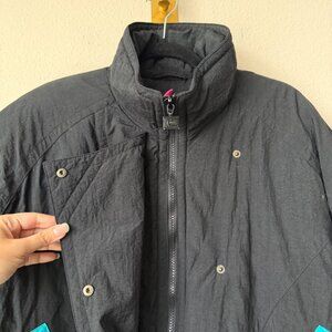 Europa by Helly Hansen black retro ski snowboard jacket. 80s 90s colorblock in turquoise, purple, yellow, and hot pink. Oversized, warm, and durable with a nylon shell, full zip + snap front, zipped side pockets, high collar, and quilted insulation. Women’s size 10 - 24" pit to pit; 24" in total length.