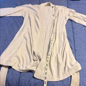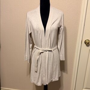 Cozy and stylish cream belted cardigan. Perfect for lounging or layering. Previously worn, but still in very good condition. Some small puncture wounds in the back of the neck area where the original tags used to be.