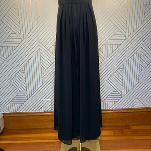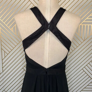 Spotlight by Warehouse Black Chiffon Halter Gown. Full length black gown features halter style neckline with empire waist. Features criss cross style cutout open back. Zip at back waist. Lined.