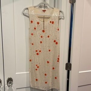 Chic mini dress with a sleeveless design. Cream background adorned with orange floral accents. Ideal for casual outings.