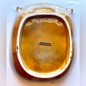 Charming ceramic owl serving bowl features a delightful blend of cream, blue and gold colors with a beautiful glazed finish. Both functional and decorative.