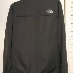 Stylish black jacket by The North Face. Features embroidered logos on chest and sleeve.