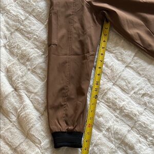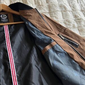 Stylish brown bomber jacket with a sleek design. Perfect for casual outings. Two waist pockets, functional pen pockets and zippered pocket on left arm. Silver zipper front. Black elastic collar, waist, and wrists. Internal liner is blue pinstriped with subtle filigree accents and and internal chest pocket.