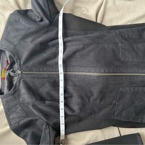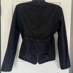 Chic black faux suede blazer with a zip front and back buckle. Stretchy side vents for a fitted look with a comfy feel. Perfect for versatile styling.
