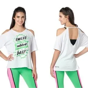 Zumba Wear Women’s Top Cold Shoulder “ Smile Added Daily” White or Black