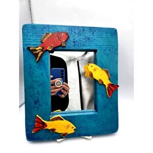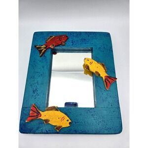 Vintage Hand Carved Painted Wood Mirror Folk Art Fish Rustic Turquoise 10"X12"