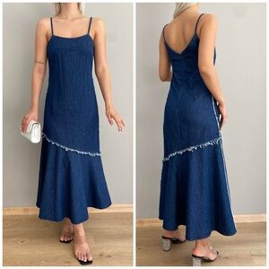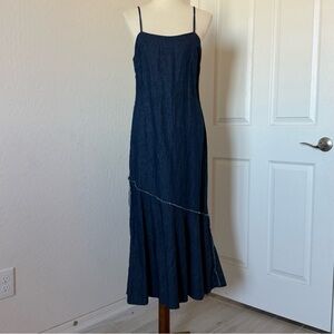 NWT Zara Denim Midi Dress in blue. It is a sleeveless dress made from a linen and cotton blend