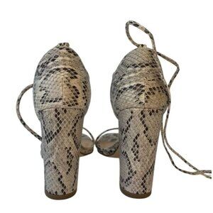 These sophisticated sandals feature a snake print design with lace-up straps. The block heel adds height and stability, making them a stylish choice for various settings.