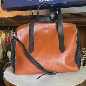 Elegant Fossil satchel in tan leather. Black handles and strap. Ideal for everyday use.