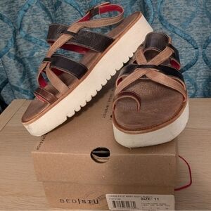 I CAN'T ACCEPT YOUR OFFER IF YOU DON'T SEND ONE! Bed Stu Crawler Genuine Leather Platform Sandals In Starry Night Lux Sz 11 In Box. $198 retail. Excellent pre-owned condition, rarely worn. Very comfortable, leather is soft, and they are true to size, a little roomier for a wider foot and the soft leather will stretch with wear. Padded, leather foot bed. Color is rustic black and tan mix on strappy flatform platform cushy sole. Ships immediately from smoke-free home.