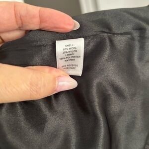 Elegant wool pea coat with double-breasted front. Features a cozy hood and sleek button accents.