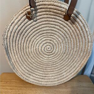 Round straw tote with green leaf accents. Features brown handles. Stylish and versatile.