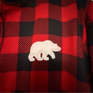 Features classic red & black buffalo check, long sleeves, cuffed ankles, soft stretch fabric, and an adorable white bear patch on the chest. Comfortable, stretchy, and easy to relax in.