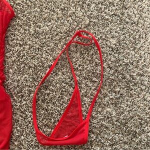 Dolls Kill Forever Yours Red Mesh Slip and Thong, New Without Tags. Size Small (size tag is on the slip but has been cut off of thong). Brand new and never used. Bold red mesh chemise. Features halter neck and cut-out design. Chain detail adds edge. Very flattering and sexy. Sold out in this size on the site.