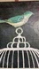 Subject: Bird on a white vintage-style bird cage with vibrant red, pink, and orange flowers against a dark, ornate background.