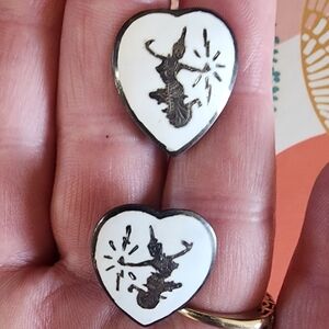 Heart shaped sterling earrings with white inlaid enamel with the enamel in near perfect condition. the backs are marked siam sterling. downsizing my collection, will need cleaned