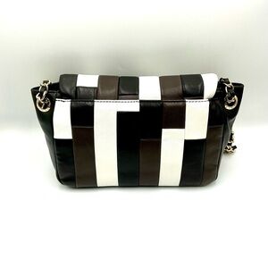 Henri Bendel stylish patchwork design in black, brown and white. Has a chain and leather strap.